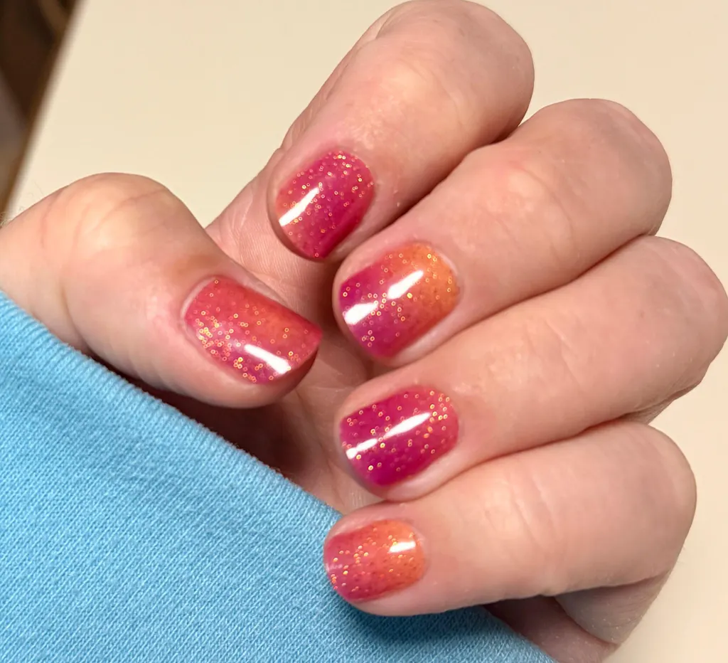Gorgeous peach and deep pink ombre. The colors remind me of a sunny day, I can’t stop staring! The glitter makes them even better. I can’t stop staring. ❤️☀️