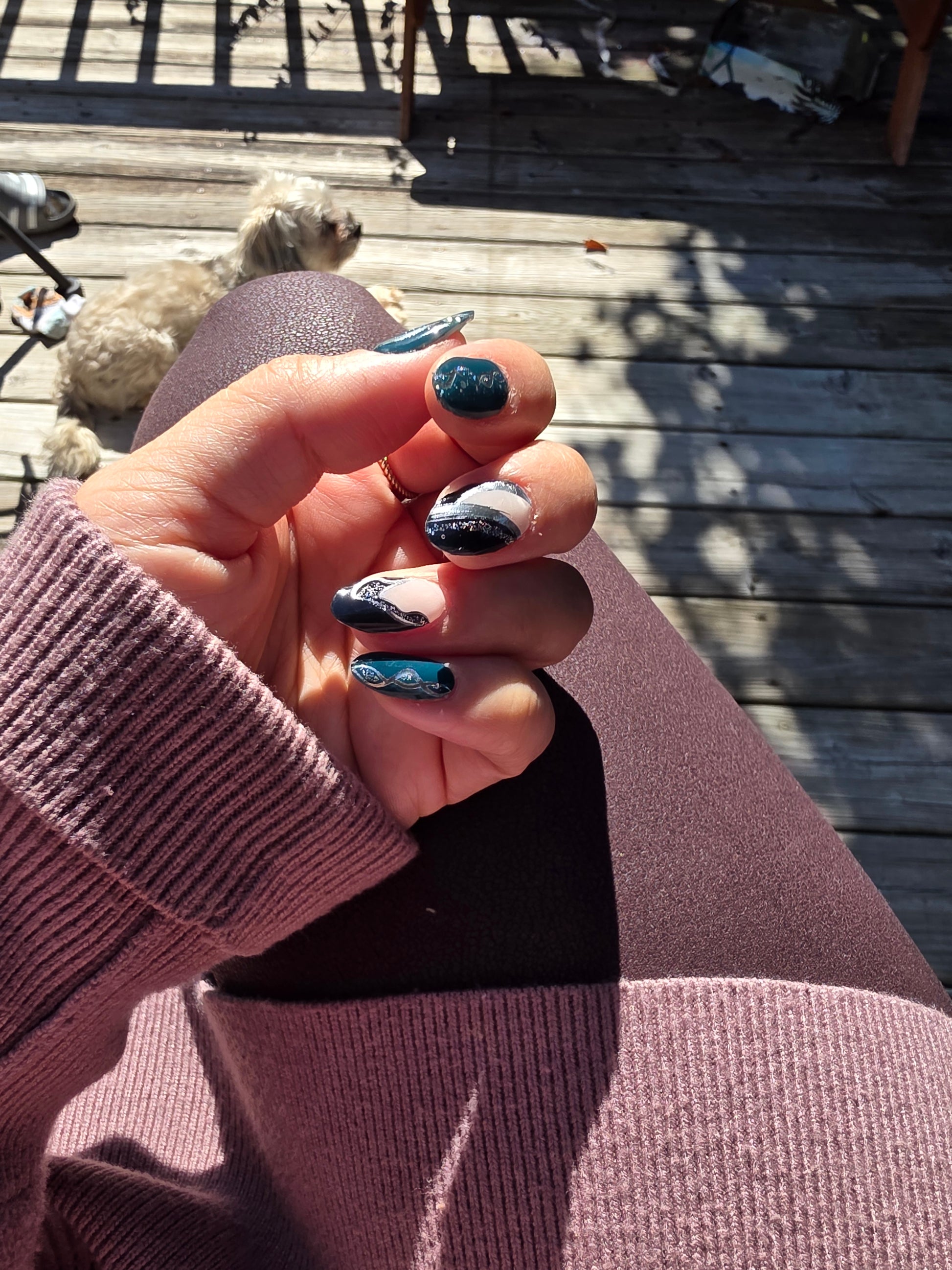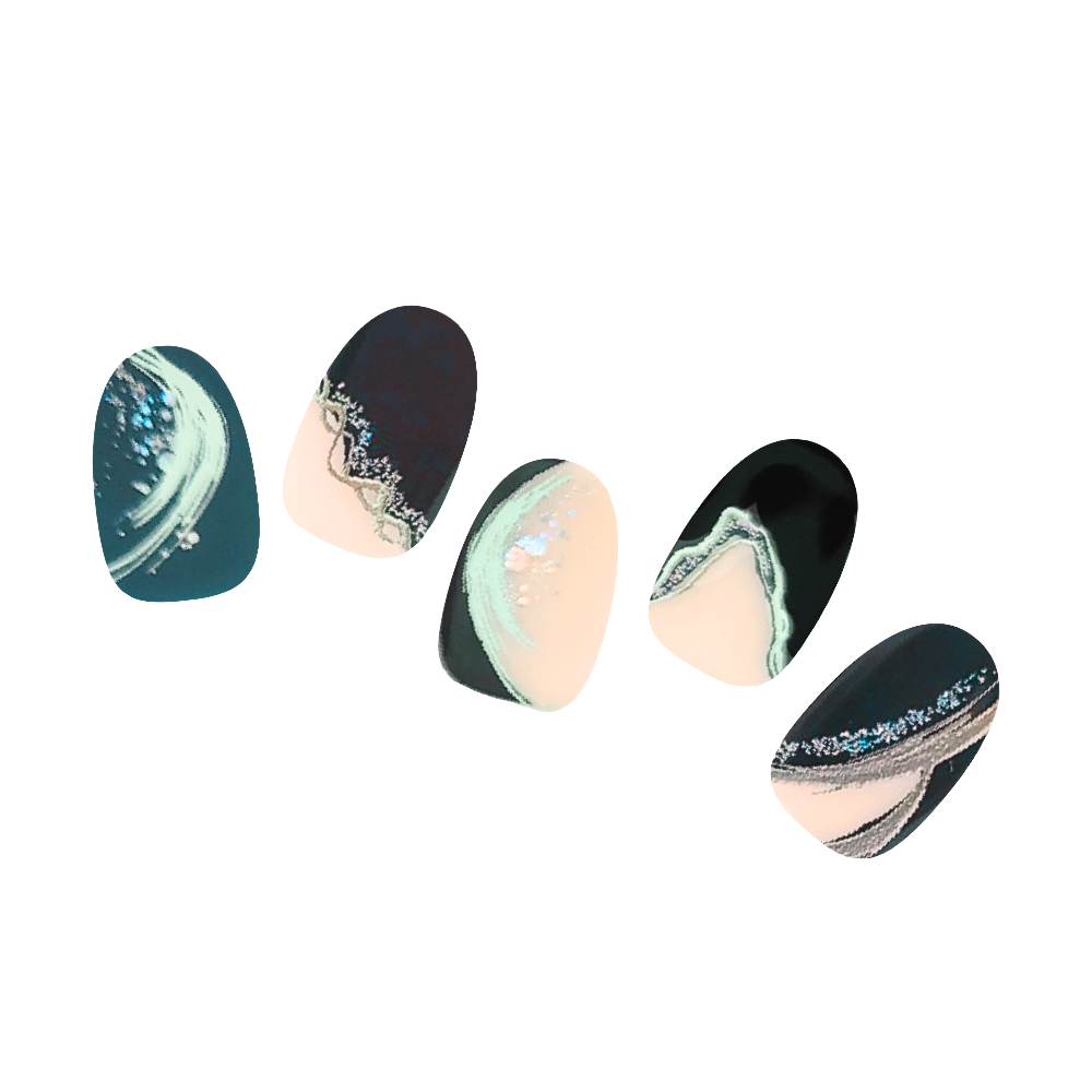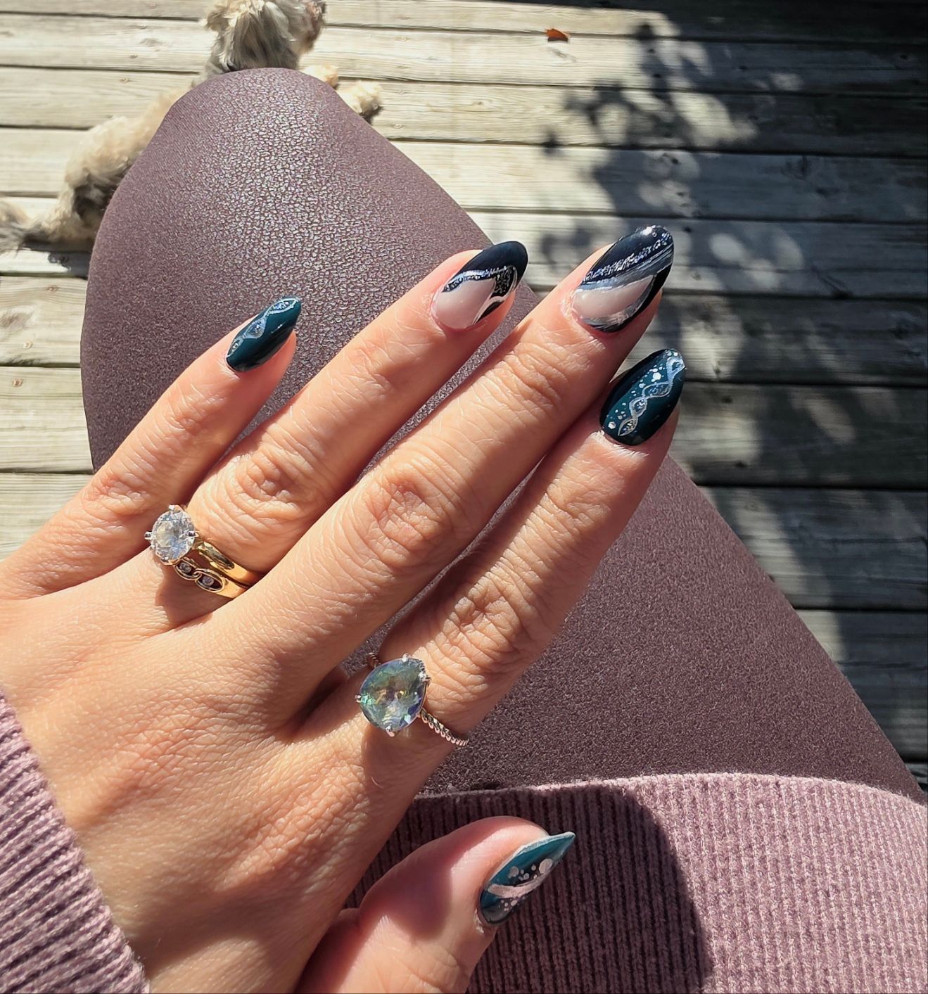 A rich teal and cream mix with soft silver accents — Enchanted brings moody nights to your fingertips. Shimmering details catch the light like autumn leaves under the moon.