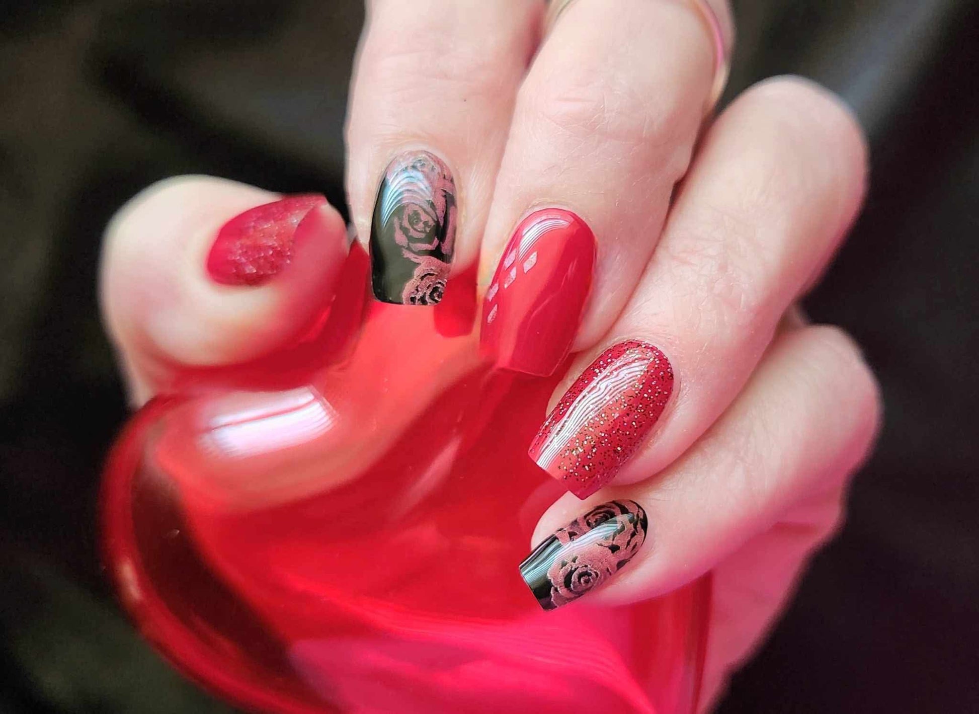 Dark romance meets bold elegance with Raven Rose. This stunning set features deep black nails adorned with moody red rose designs. Crimson red glitter accents. 🌹🖤