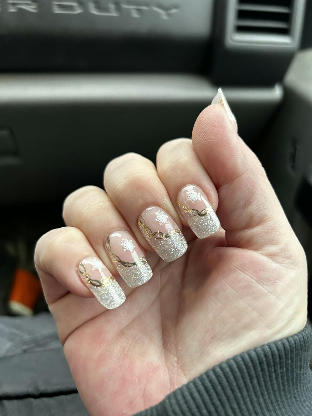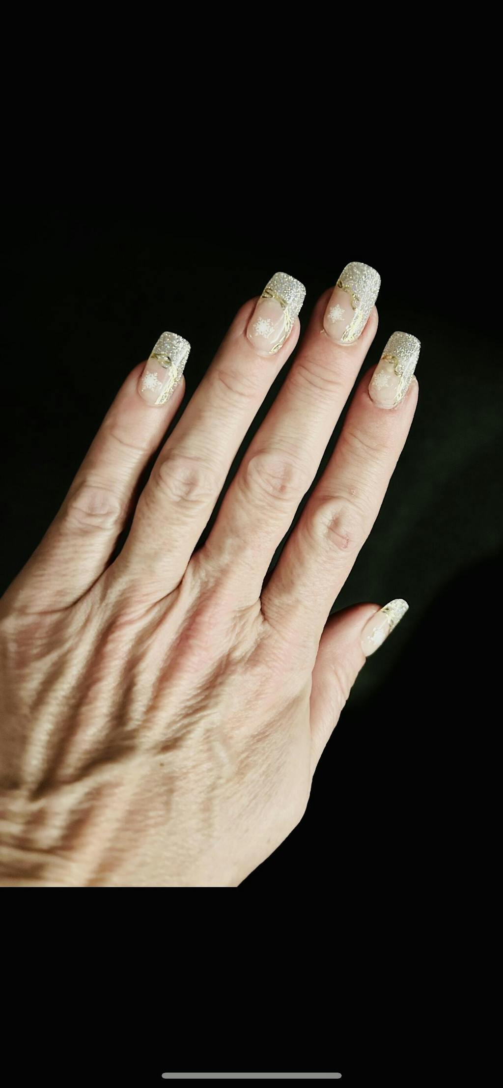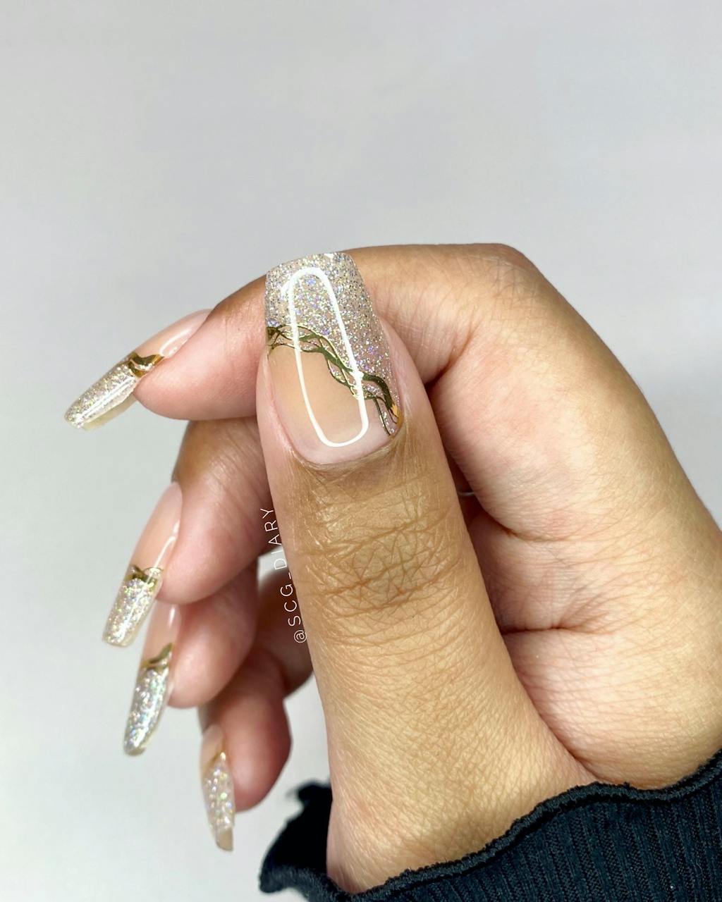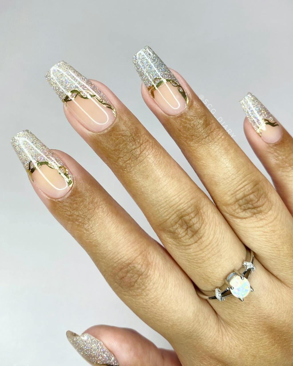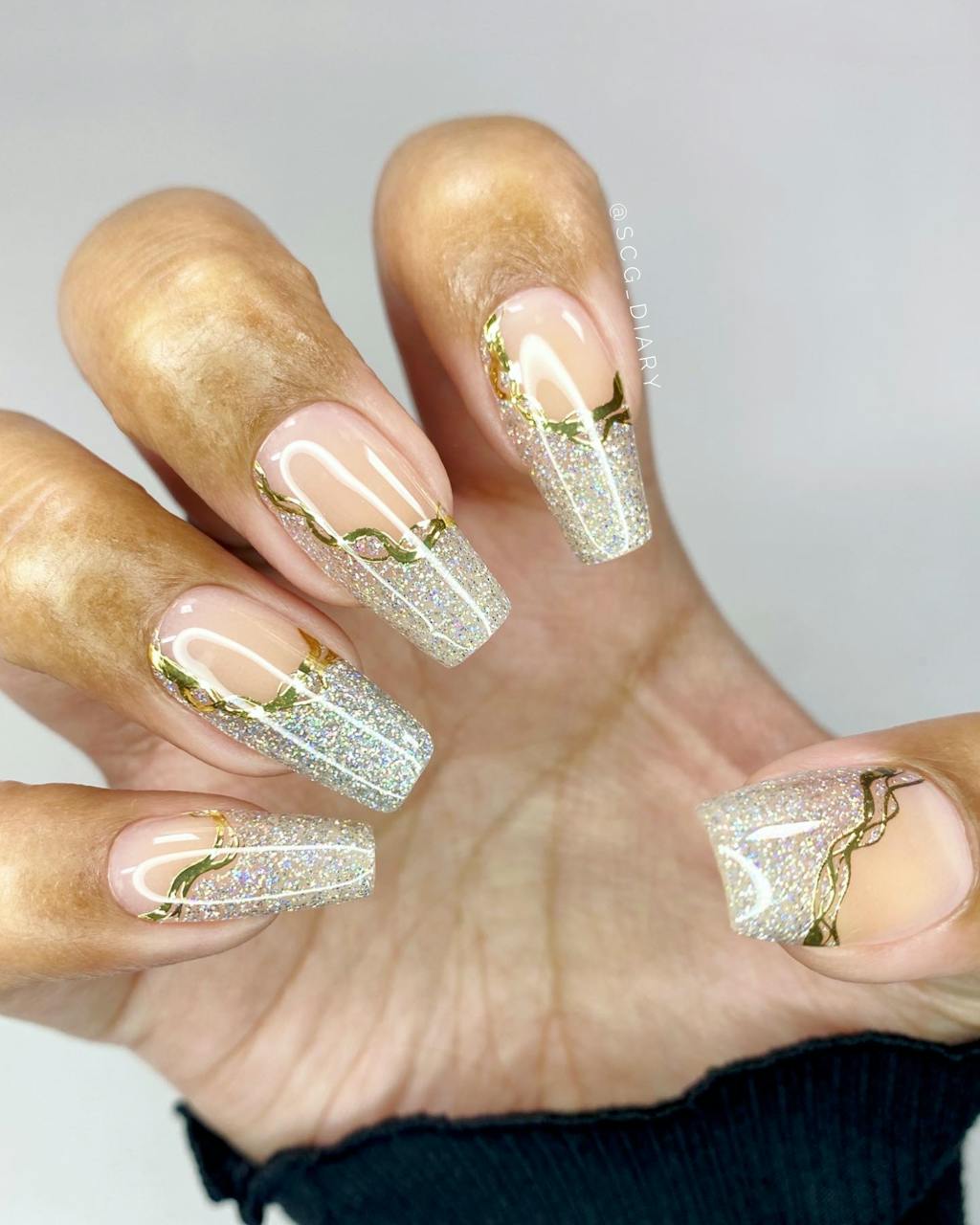 Glow like a true gem! With holo glitter tips, gold line accents, and a natural tint base, this design takes hints from the stunning beauty of geode crystals.