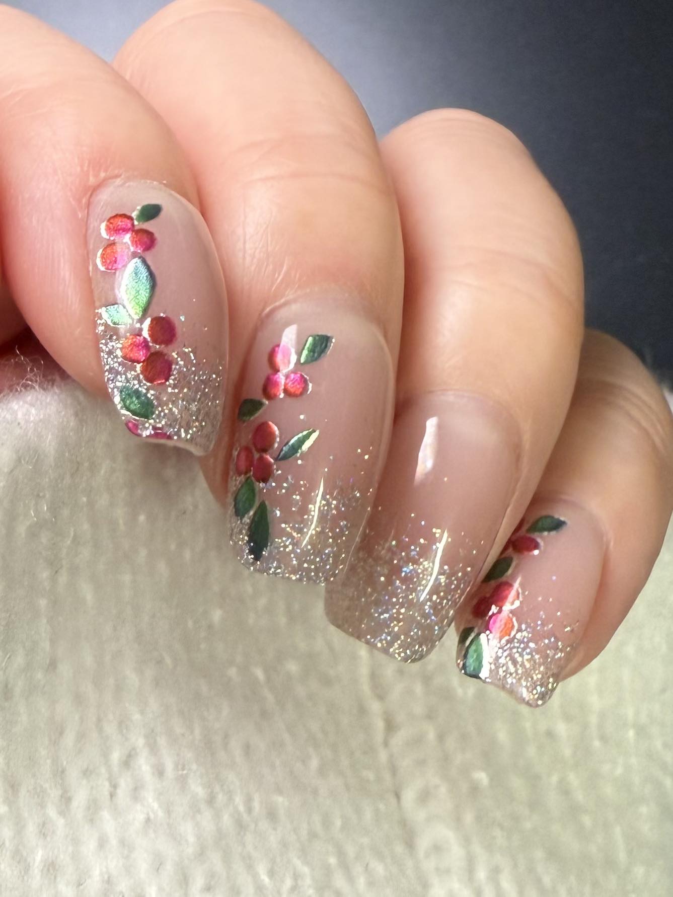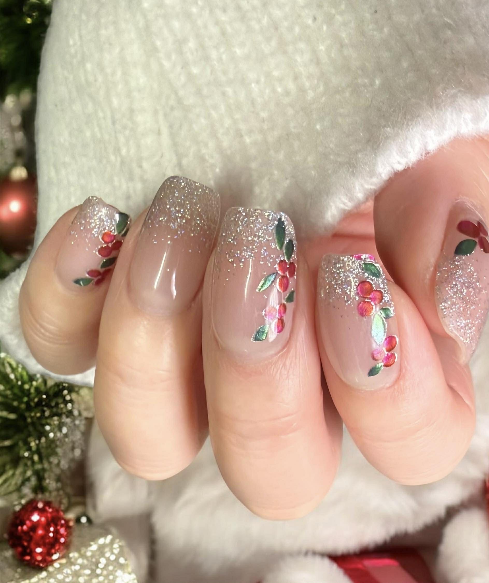 Frosty and festive, Snowberry brings winter magic to your fingertips! A milky pink-white meets shimmering silver glitter and adorable holly berries. It's giving holiday ❄️🎄